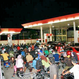 Masyarakat mengantri di SPBU Lampineung (depan asrama haji) Banda Aceh Senin (17/11/2014), pukul 11.30 WIB. Mereka mengantri hingga tengah malam karena mulai esok hari harga BBM naik. |