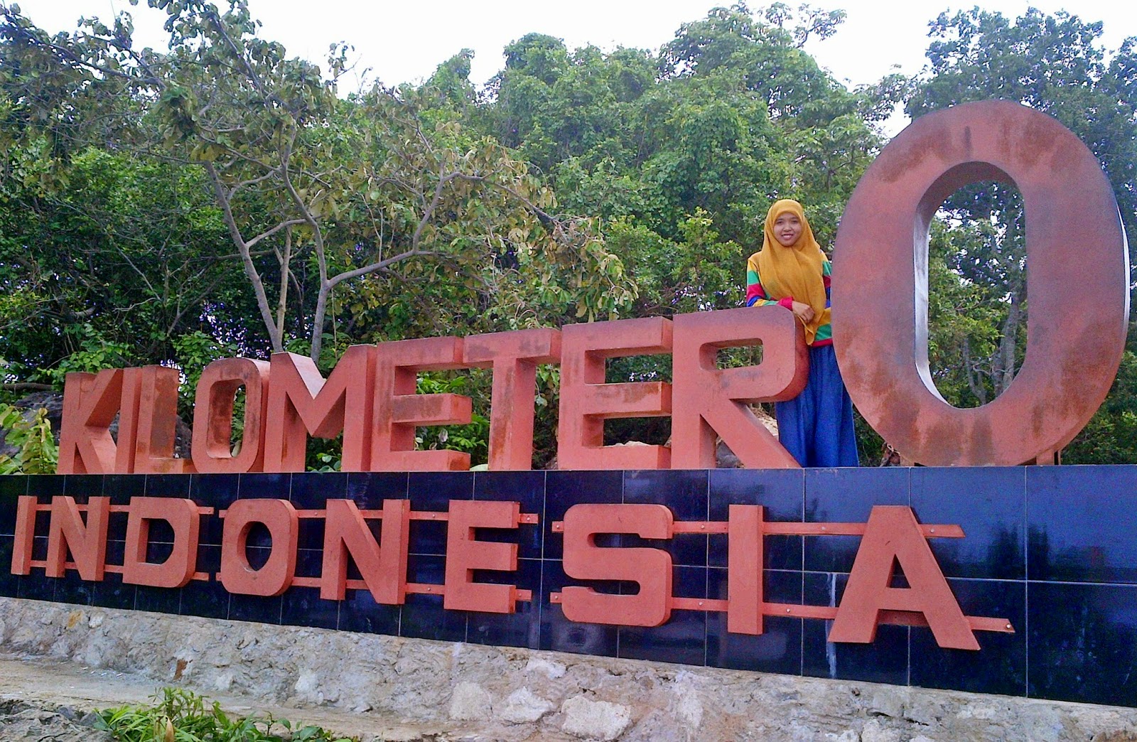 Selama kurang lebih sejam lamanya, akhirnya saya bersama suami tiba di lokasi. Begitu turun dari sepeda motor, mata saya langsung tertuju pada sebuah tulisan besar berbunyi 'Kilometer 0 Indonesia' yang terbuat dari besi. Tepat dibelakangnya terdapat sebuah tugu, tugu Kilometer Nol. Dua spot ini menjadi lokasi favorit untuk berfoto ria, tanda pengunjung sudah menginjakkan kakinya di titik paling barat Indonesia. Pada saat saya tiba, secara tidak langsung saya juga harus mengantri untuk bisa berfoto dan mendapatkan gambar yang bagus di kedua spot ini, karena banyak pengunjung lain yang juga berfoto di sana.